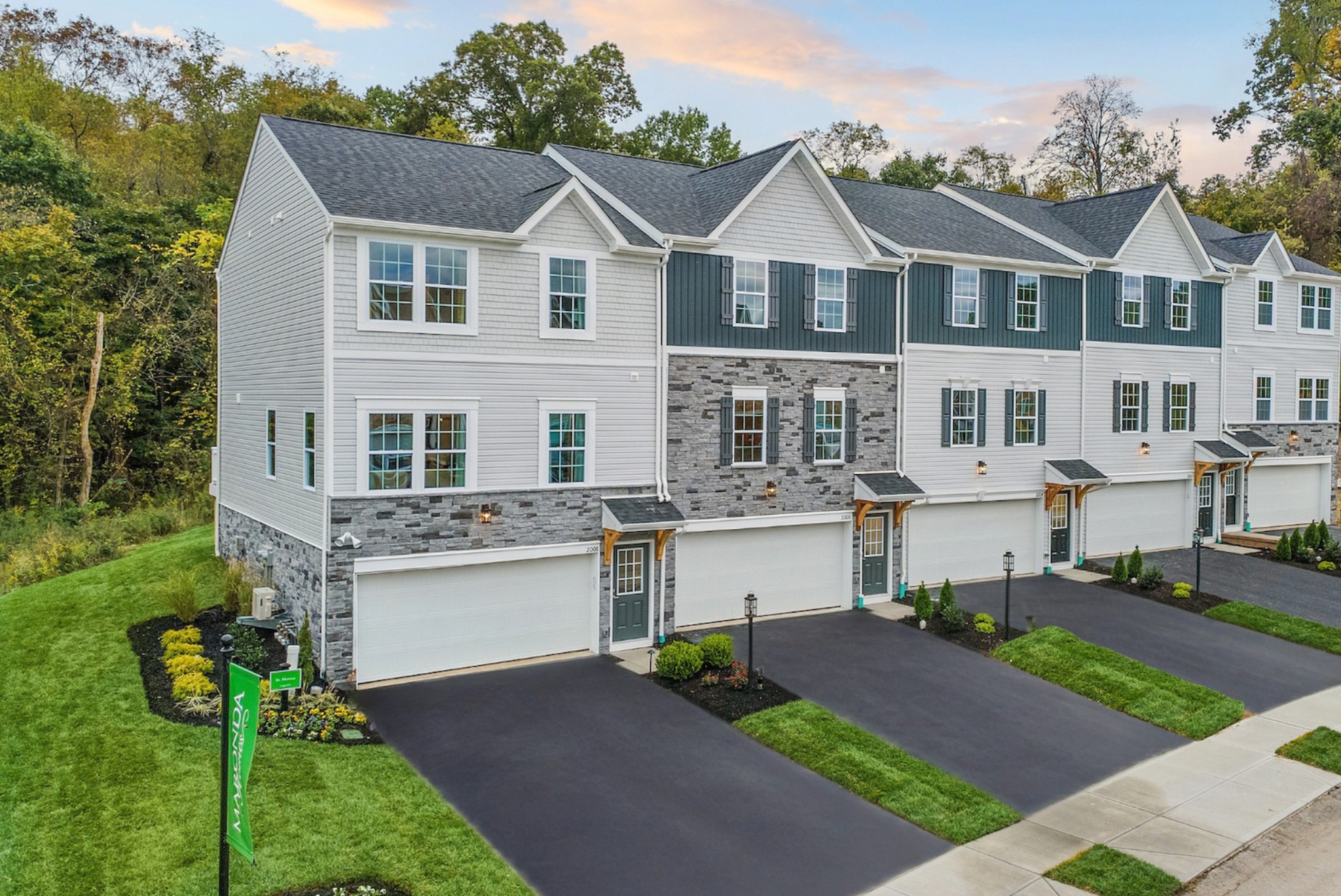 Modern townhouses with a stone and vinyl exterior, nestled in a lush green landscape featuring landscaped front yards and driveways.
